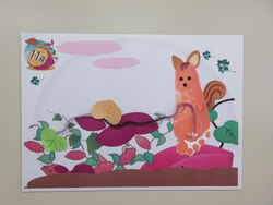 子どもの足形で、リスを表現し好きなパーツやシールを貼り、いもほりをしている作品にします。作ったカードは持ち帰りできます。