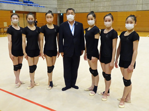 9月2日、海外での試合を終え、バルドラール浦安アリーナで練習している新体操日本代表フェアリージャパンPOLAを、内田市長が激励のため訪問しました。