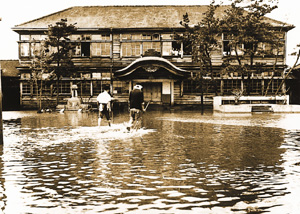 大正6年9月24日、フィリピン群島洋上に発生した台風は同月30日の夜半に当時の観測史上でもまれな超低気圧となって関東を襲いました。しかも、この日は年間を通して最も平均潮位の高い旧暦十五夜の満月にあたっていたため、発生した高潮は一瞬のうちに浦安を襲い、瞬く間に町内一帯は浸水。この時のようすを、アリが柱をはいあがるように水があがってきたと語る人もいたといいます。